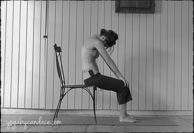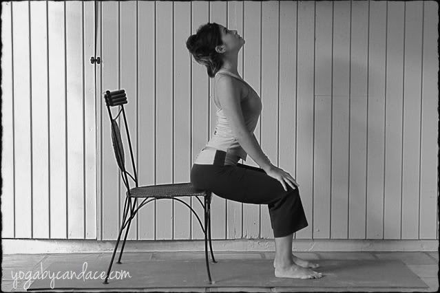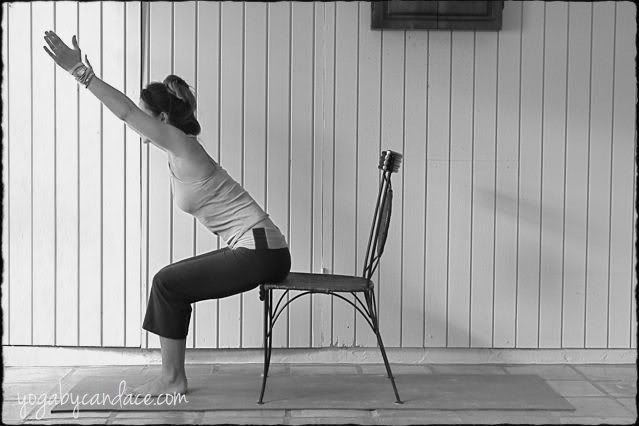 Step 1: Sit on the edge of your chair, feet together, knees together. Squeeze the thighs together. Inhale and send your body forward at an angle, lifting the arms. Be mindful to keep the back straight- do not sway the back. Energized arms and fingers. Exhale the shoulders away from the ears, pushing into all four corners of the feet, continuing to hold. Hold for five deep breaths, then ....